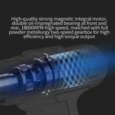 گیربکس ضربهای، موتور DC12V یکپارچه مغناطیسی قوی با کیفیت بالا، یاتاقانهای دوگانه آغشته به روغن در انتهای جلو و عقب، حداکثر فرکانس ضربه 21000، مجموعا برای ایجاد ضربههای قوی و تحقق عملکرد حفاری ضربهای دست به دست هم میدهند.
