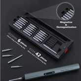 • دارای 48 عدد سری • دارای جعبه آلومینیومی • مقاوم در برابر سایش • دارای یک عدد مگنتایز پیچ گوشتی Xiaomi Bomidi EPS03 Screwdriver یکی از محصولات با کیفیت کمپانی شیائومی است که با ساختار خوب خود و تعداد بالای سری های پیچ گوشتی که در آن قرار داده شده است، می تواند گزینه بسیار مناسبی برای هر خانه و خانواده باشد. به طور کلی این محصول برای کسانی که با این ابزار سر و کار دارند گزینه بسیار مناسبی است و مانع از خرید انواع مختلفی از پیچ گوشتی ها می شود که فضای زیادی را هم اشغال می کنند. پیچ گوشتی Xiaomi Bomidi EPS03 دارای بدنه ای استوانه ای و فرم شیاردار است که برای پیچاندن پیچ ها و کار با پیچ گوشتی خوش دست تر و کاربری خوبی داشته باشد. پیچ گوشتی شیائومی EPS03 به همراه 48 سری پیچ گوشتی در داخل محفظه ساخته شده از آلومینیوم با کیفیت و جمع و جور قرار گرفته تا حمل و نقل آن بسیار راحت باشد. همچنین این محصول دارای 6 سری 45 میلیمتری و 42 سری 28 میلیمتری است. همچنین باید افزود که طراحی دسته به گونه ای است که مانع از لیز خوردن آن هنگام کار می شود و شما به راحتی می توانید به کار کردن با آن ادامه دهید. بر روی پیچ گوشتی پورت شارژ تعبیه نشده و شما با قرار دادن پیچ گوشتی در کیس و اتصال کیس به شارژر، پیچ گوشتی را شارژ کنید. بر روی بدنه این محصول کلیدی به منظور تعیین جهت چرخش سری پیچ گوشتی تعبیه شده است.
